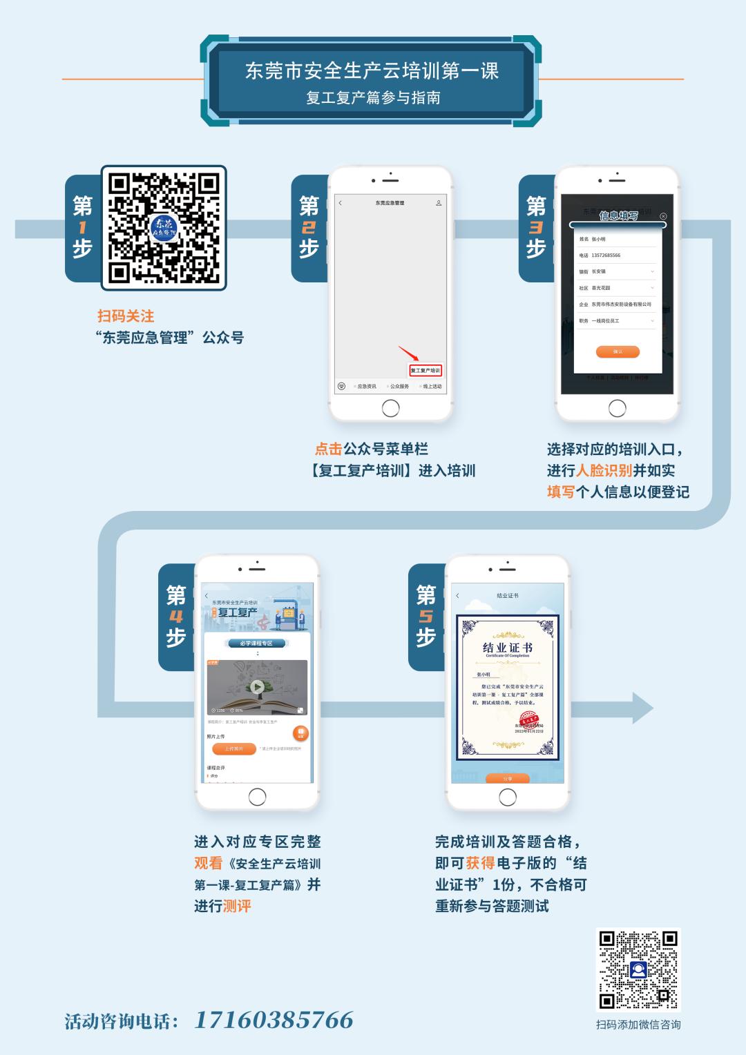 參與指南:關(guān)注“東莞應(yīng)急管理”公眾號,通過點擊公眾號菜單欄【線上活動→復(fù)工復(fù)產(chǎn)培訓(xùn)】,登記個人信息,完成注冊后,點擊“我要參加”進入培訓(xùn)內(nèi)容界面,點擊觀看視頻進行學(xué)習(xí)。